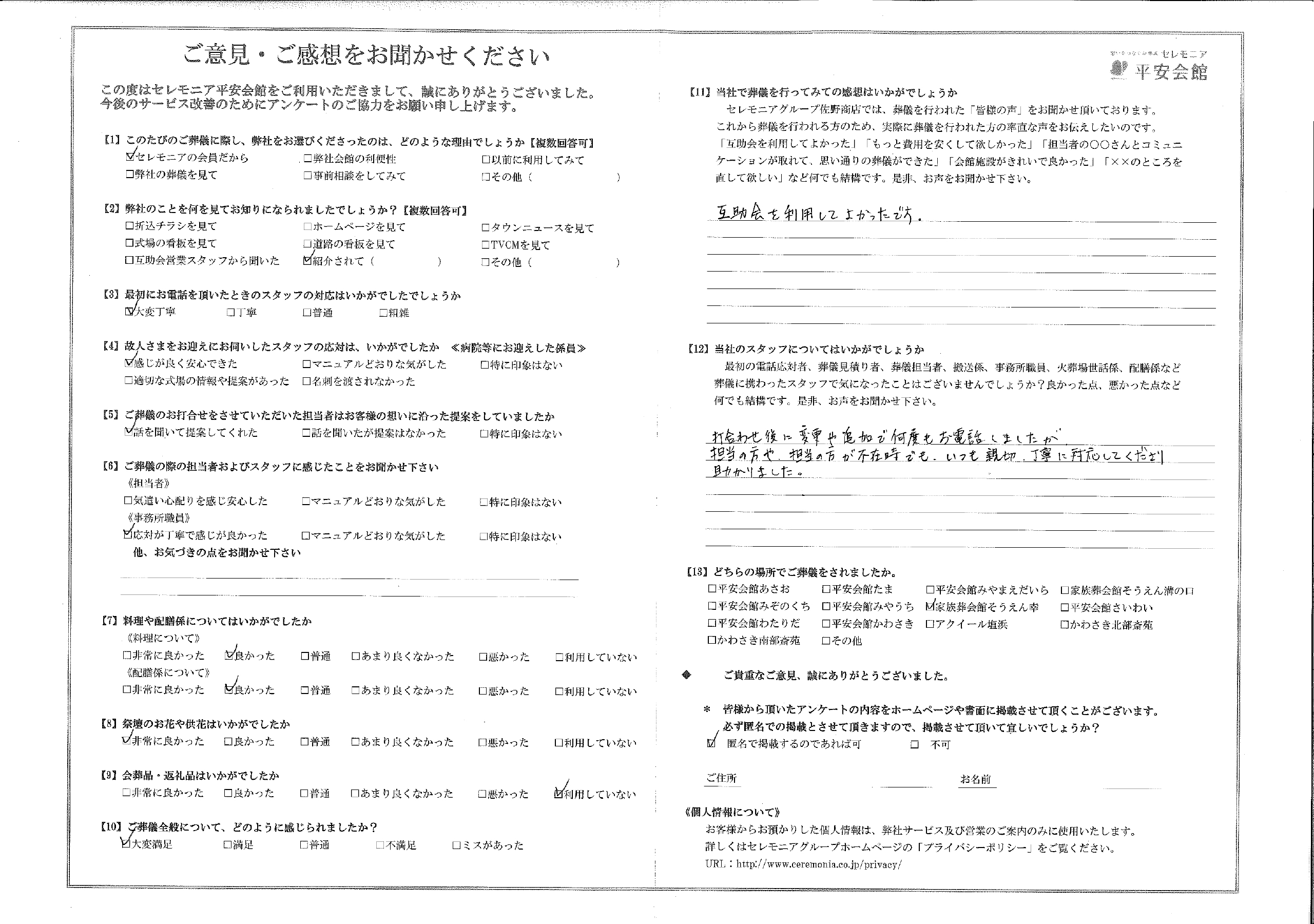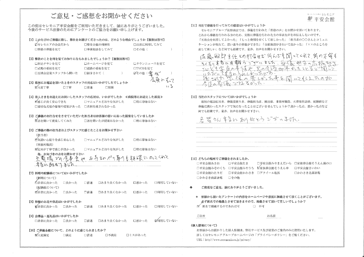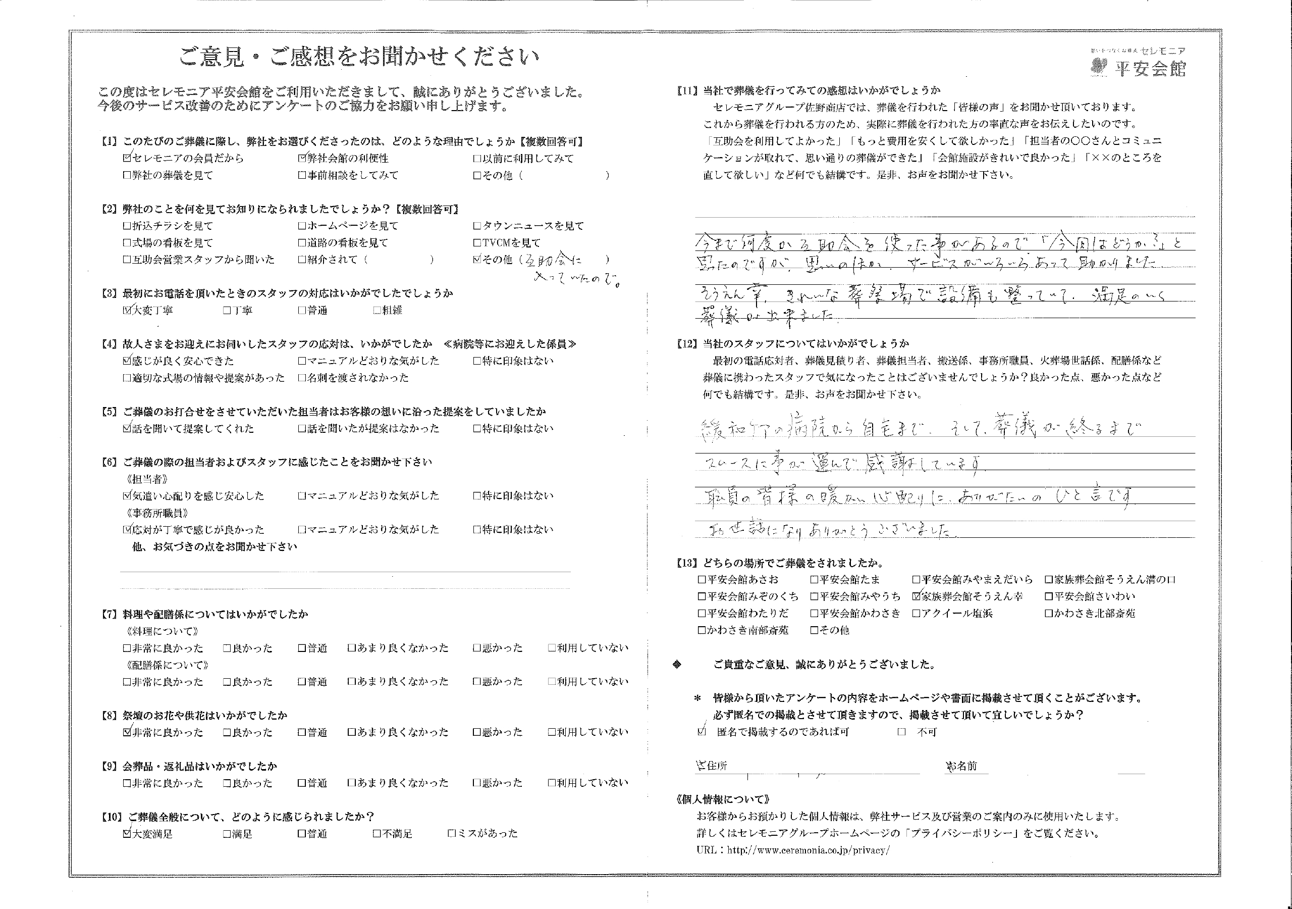 平安会館をご利用いただいたお客さまより、感謝のお声を頂きました